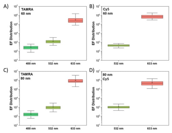 EF distribution box plots. (A,B) EF obtained for the dimers containing 60 nm AuNP modified with TAMRA and Cy5 respectively. (C,D) EF obtained for the dimers containing 80 nm AuNP modified with TAMRA and Cy5 respectively.
