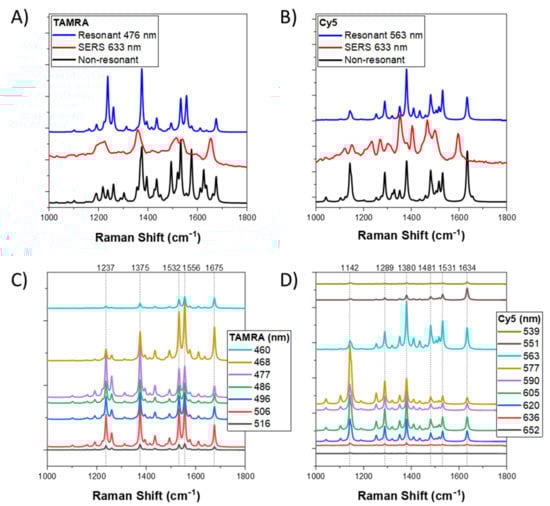 From the simulated data shown in Figure 7C,D, we observe that the resonance Raman spectra have high intensities only in a region of the visible spectrum close to (and somewhat below) the vertical excitation energies to the first bright singlet states. For TAMRA, the resonance effect is observed between 516 and 460 nm, and for Cy5 the resonance is most important between 652 and 539 nm. While in good agreement with computed vertical excitation energies, those wavelengths do not match exactly the experimental absorptions but are close enough to directly correlate to our experimental SERS data. Note also that the computations were done for free molecules in a water solvent, without the presence of nearby nanoparticles, DNA, or ions. Although it is well-known that the molecular orientation with respect to the surface plays an important role for SERS, the dye molecules in the present experiments are not directly adsorbed to the nanoparticles, but bound to the DNA via linkers. Therefore, they are relatively free to rotate. Furthermore, in the experiments many molecules are detected within one measurement, i.e., the spectra represent an average conformation of the molecules within the nanoparticle gap. Consequently, the experimental spectra are comparable with the calculated spectra, which do not take the surface directly into the account and which are averages over all molecular orientations [4,41]. Another point is that we do not observe substantial peak shifts due to the different excitation wavelengths in the simulations, in accordance with our SERS data, where the peak positions are largely independent of the laser used.