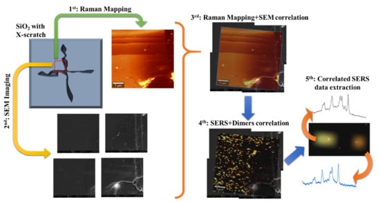 Schematics showing the correlation procedure as described previously in the methodology. The scratch-marked SiO2 substrate with the nanostructures is first mapped by Raman and later by SEM, which can be correlated in one image, which later is used to correlate the SERS signals with the dimers distributed in the SiO2, the spectra are then collected and analyzed.