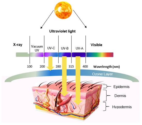 UVR can be divided into three main spectrums: UVA (315–400 nm), UVB (280–315 nm), and UVC (200–280 nm) [3,21]. While the majority of UVR reaching the Earth is within the UVA spectrum, 5 to 10% comes from UVB. On the other hand, UVC is entirely blocked by the ozone layer; hence, it does not affect the biota. The radiation energy is inversely proportional to the wavelength; the longer the wavelength, the lower the energy. Conversely, the skin penetration depth is proportional to the wavelength. Therefore, UVA can penetrate deep layers of the epidermis, reaching the basal layer while UVB can only penetrate the epidermis, given its shorter wavelength.