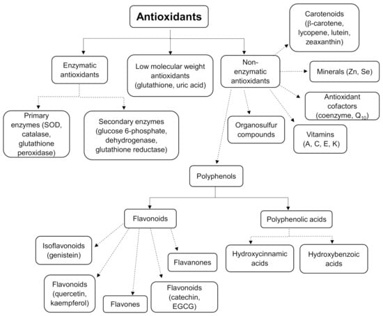 Antioxidants are a crucial group of compounds that protect the body from excessive free radical oxidation. Antioxidants can be categorised either as primary, secondary, or tertiary antioxidants or as enzymes, vitamins, flavanoids, carotenoids, phenolic acids, and polyphenols (Figure 2) [39]. Primary (or preventative) antioxidants work via the inbihibtion of radical initiation reactions to slow the rate of radical production. Secondary antioxidants, otherwise known as chain-breaking antioxidants, work by disrupting the propagation reactions, and tertiary antioxidants work by repairing the damage caused by free radical oxidation [40].