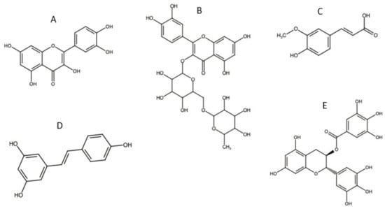 Chemical structures of commonly natural antioxidants complexed with cyclodextrins (CDs): (A) quercetin (QCT), (B) rutin, (C) ferulic acid, (D) trans- resveratrol, and (E) epigallocatechin Gallate.