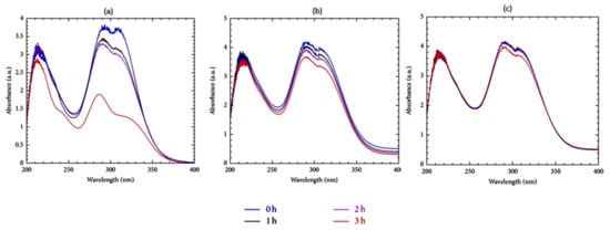 Change in UV absorption spectra of sunscreen sample containing a mixture of UV filters after different times of irradiation. (a) Free of β-CD; (b) 5 g β-CD; (c) 10 g β-CD [76].