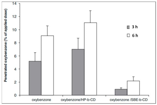 Chemical UV filters tend to penetrate the skin after topical application. This not only decreases their photoprotective capabilities but also leads to phototoxicity or photo-allergenicity. According to Scalia et al., the amount of avobenzone penetrating the stratum corneum was significantly reduced after encapsulation in HP-β-CD, with >70% of the applied dose remaining on the uppermost skin layer [79]. Furthermore, the permeation of UV filters was dependent on CDs concentrations; higher concentrations of HP-β-CD resulted in lower flux rates [80]. Likewise, the inclusion complex of oxybenzone in HP-β-CD and sulfobutylether-β-CD (SBE-β-CD) led to an increase in the aqueous solubility of oxybenzone (up to 1049-fold) whilst significantly limiting its percutaneous absorption (Figure 7) [81]. Furthermore, Shokri et al. reported that the absorption lag time and overall percutaneous flux of avobenzone, oxybenzone, and ensulizole were reduced by 4 to 15-fold after complexation with β-CD [82].