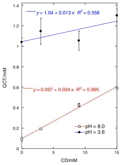 Phase solubility graph of QCT with HP-β-CD in phosphate (pH = 8.0) and citrate (pH = 3.6) buffers [90].