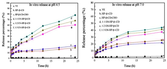 Cumulative release (%) of vitamin E, and its inclusion complexes with HP–β-CD and EN–HP–β-CD at pH 4.5. and pH 7.0 [103]. EN: ethylenediamine, HP: hydroxypropylated form.