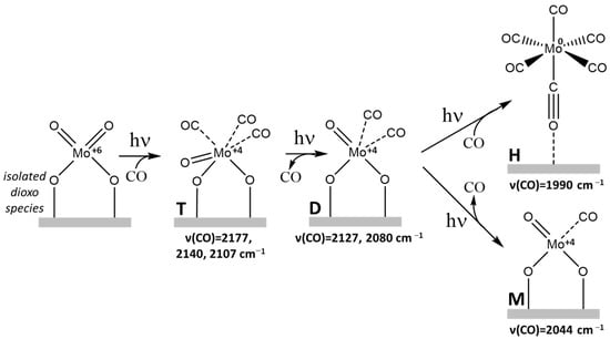 As it is possible to see in Figure 2, the triplet and the doublet discussed above are not the only manifestations observed during the irradiation of the sample in the presence of CO. Indeed, a complex system of superimposed absorptions also gradually develops at wavenumbers below 2060 cm−1. Among them, an absorption at 2044 cm−1 and an envelope of bands in the 2010–1960 cm−1 region with a main maximum at ca. 1990 cm−1 becomes more and more evident. In the literature, a band at 2045 cm−1 was attributed to a linear molybdenum monocarbonyl, Mo(CO) (M in Figure 1). As far as the manifestations at lower wavenumbers are concerned, in ex situ experiments photoreduction in CO of Mo6+/SiO2 is supposed to also lead to the formation of Mo metal centers able to form physisorbed and chemisorbed hexacarbonyls Mo0(CO)6 (H in Figure 1), which show a stretching C-O mode at 1990 cm−1 [27,33]. We think that similar species are responsible for the complex spectrum we observe in the 2010–1960 cm−1 region (Figure 2).
