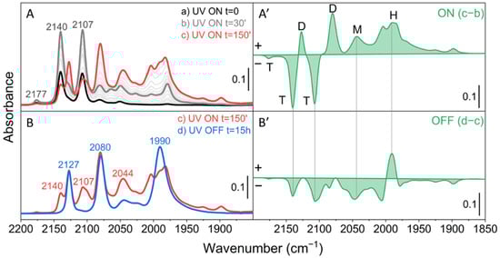 Figure 2. FT-IR spectra during photoreduction of Mo/SiO2 in the presence of CO at 50 mbar. (A) Effect of photoreduction time up to 150 min of UV irradiation. (B) Effect of 15 h in dark conditions after photoreduction. The spectrum of the oxidized material in the presence of CO gas, before UV irradiation, has been subtracted from all spectra. (A’) Difference spectrum (c−b) to underline the spectral evolution from 30 min to 150 min. (B’) Difference spectrum (d−c) showing the effect of switching off the UV lamp. The letters T, D, M and H refer to the molybdenum species shown in Figure 1.