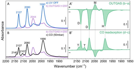Figure 3. FT-IR spectra of Mo/SiO2 after photoreduction in CO. (A) Comparison of the spectra after stopping the UV irradiation (blue curve) and after 200 min of CO evacuation in dark conditions (purple curve). (B) Comparison of the spectra of the outgassed sample and after readmission of CO at 50 mbar (black curve). The spectrum of the oxidized material in the presence of CO gas, before UV irradiation, has been subtracted from all spectra. (A’) Difference spectrum (b−a) to underline the effect of CO evacuation. (B’) Difference spectrum (d−c) showing the effect of CO readsorption. The letters T, D, M and H refer to the molybdenum species shown in Figure 1.