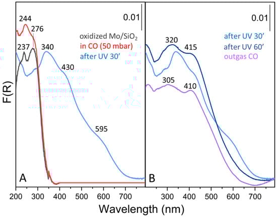 Figure 4. Diffuse reflectance spectra of the Mo/SiO2 system. (A) In the initial fully oxidized conditions (black curve), after CO admission (red curve) and after UV irradiation for 30 min. (B) Effect of UV irradiation up to 60 min (blue curves) and of CO outgassing (purple curve).
