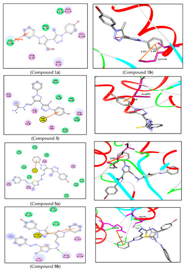 | 5a | ![]() | −8.2 | Arene-cation interaction Arg96:NH1-compound 5a | 3.95 |