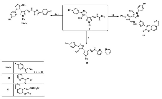 - Elnaggar, D.H.; Abdel Hafez, N.A.; Rashdan, H.R.M.; Abdelwahed, N.A.; Awad, H.M.; Ali, K.A. Synthesis, Antimicrobial and Antitumor Evaluations of a New Class of Thiazoles Substituted on the Chromene Scaffold. Mini. Rev. Med. Chem. 2019, 19, 1717–1725. [Google Scholar] [CrossRef] [PubMed]