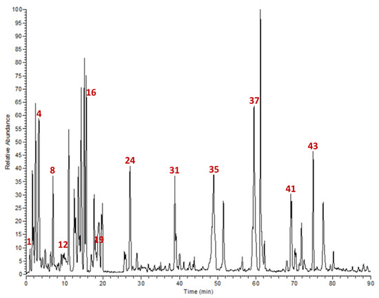 Base peak chromatogram of L. coronopifolia Poir. aerial parts’ extract.