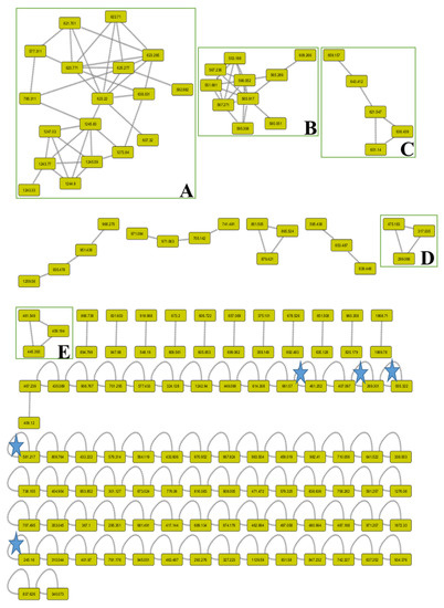 In the negative network, five clusters, A, B, C, D, and E, were mentioned and annotated as apigenin derivatives, which were grouped as methylated flavones, O-glycosidic flavones, C-glycosidic flavones, and/or biflavones. In addition, the other self-looped nodes asterisked within the network were denoted as phenolic-O-glycosides, N-acetylamino acid, flavan-3-ol, phenolic acids, and biflavones.