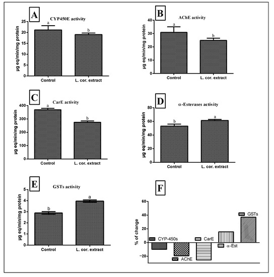 Effects of L. coronopifolia extract (L. cor.) on the enzymatic activities of cytochrome P-450 monooxygenase (CYP-450s) (A), carboxylesterase (CarE) (B), acetylcholinesterase (AchE) (C), α-esterases (D), and glutathione S-transferase (GSTs) (E) in the 3rd larval instar of C. Pipiens. (F); % of changes. Data were represented as mean ± SE. Lowercase letters above the bars indicate significant differences between different treatment groups (Duncan’s multiple range test, p < 0.01). Error bars indicate 95% confidence intervals.