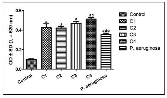Results of biofilm formation of P. aeruginosa. Isolates were classified as negative (OD ≤ ODc), weak (ODc ≤ OD ≤ 2ODc), moderate (2ODc < OD ≤ 4ODc), and strong biofilm production (4ODc <OD). OD = optical density. a Significant compared to control at p < 0.05. b Significant compared to C1 at p < 0.05. c Significant compared to C2 at p < 0.05. d Significant compared to C3 at p < 0.05. e Significant compared to C4 at p < 0.05.