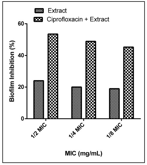Antimicrobial resistance (AMR) has increased markedly in the recent years and is causing a major threat to patients’ treatment. P. aeruginosa, for example, has developed antibiotic resistance, and its increasing dissemination is causing severe infections in hospitals. Combinations of plant extracts with antibiotics represent a novel approach to increase their effectiveness and to overcome AMR. In an attempt to explore the synergistic activities of the extract, we combined it with the reference drug ciprofloxacin in a 1:1 ratio. The combination of ciprofloxacin and the extract substantially potentiated the reduction of biofilm from 24%, 20%, and 19% to 53.5%, 48.9%, and 45.26% at 1/2, 1/4, and 1/8 MICs, respectively (Figure 6). Our findings come in agreement with those of Okansi et al. (2013), who reported a synergy when ciprofloxacin was combined with the methanol extract of Phyllantus muellerianus leaves (containing flavonoids) against P. aeruginosa [59]. Another study described the synergistic activities against P. aeruginosa when zingerone extract was combined with the reference drug ciprofloxacin [60].