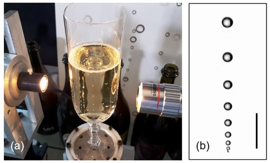 High-speed video imaging device aimed at filming ascending bubbles in glasses poured with sparkling wines (a), with a micrograph showing CO bubbles rising in-line and growing by diffusion along the side of the glass (b) (bar = 1 mm). (photographs by G. Liger-Belair).