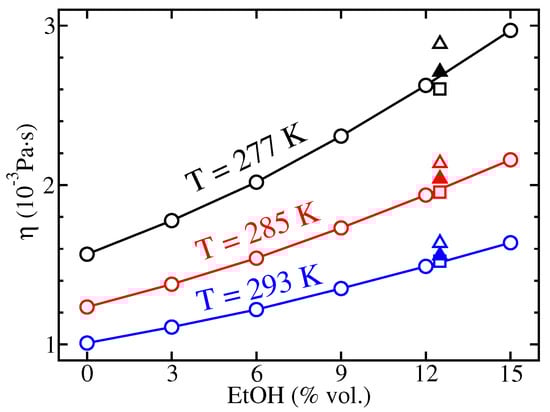 Experimental viscosities of hydroalcoholic solutions at T = 277 K (black circles), T = 285 K (red circles), and T = 293 K (blue circles). Viscosities from the literature obtained for hydroalcoholic solutions (open squares) and brut-labeled champagnes (triangles) are also indicated [33]. Data on brut-labeled champagnes are derived from viscometry (open triangles) and an Arrhenius law (closed triangles) [33,39].