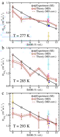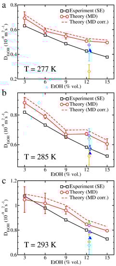 Experimental and theoretical CO diffusion coefficients in carbonated hydroalcoholic solutions at (a) T = 277 K, (b) T = 285 K, and (c) T = 293 K. Experimental values (black squares) derived from the Stokes-Einstein (SE) relation and theoretical values deduced from molecular dynamics (MD) simulations (red circles) are reported together with theoretical diffusion coefficients corrected for system-size dependence (red dashed curve). Data from the literature are also indicated: MD simulations on carbonated hydroalcoholic solutions (ethanol (EtOH) at vol.) where water is described by the OPC (Optimal Point Charge) model (green diamond) [34], TIP4P/2005 (Transferable Intermolecular Potential with 4 Points/2005) model (magenta diamond) [34], SPC/E (Extended Simple Point Charge) model (orange diamond) [33,42], and TIP5P (Transferable Intermolecular Potential with 5 Points) model (cyan diamond) [33]; C nuclear magnetic resonance (NMR) measurements on carbonated hydroalcoholic mixtures [33] or fizzy water [30] (blue open triangles) and brut-labeled Champagnes (blue closed triangles) [33].