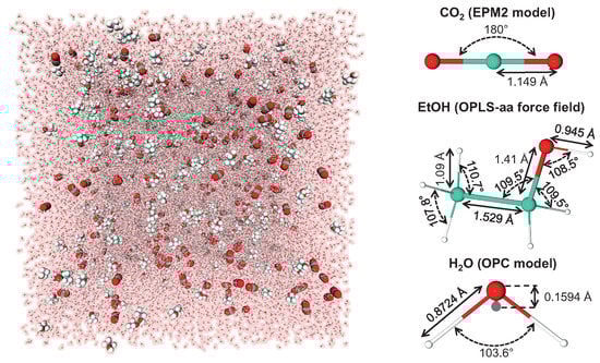 Example of simulation box containing HO, 200 CO and 385 EtOH (3% vol.). Bond distances and angles of the three molecules used in our model are indicated on the right panel. Pictures were generated with the VMD (Visual Molecular Dynamics) and Protein Imager softwares [62,63].
