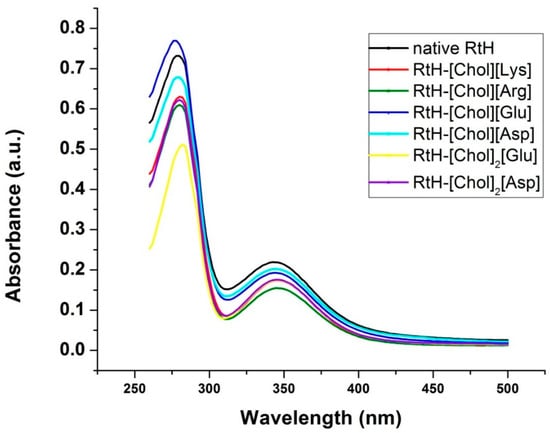 In the presence of [Chol][Lys] and [Chol][Arg], we observed the most significant increase in the content of β-structures and a complete loss of the unordered structures, while the α-helical structures were preserved. In these two ILs, the structure seems more ordered. Similarly, in a previous study, we found that [Chol][Lys] and [Chol][Arg] induce unfolding of insulin, while the share of the β-sheets increases on behalf of the α-helices [14]. In the presence of [Chol]2[Asp], the structure of RtH is preserved and is very close to the structure of the protein in buffer. More open structure and side-chain amino acids exposed to the environment are observed in the spectra of RtH in the presence of [Chol][Arg], mono[Chol][Glu], and [Chol]2[Asp].