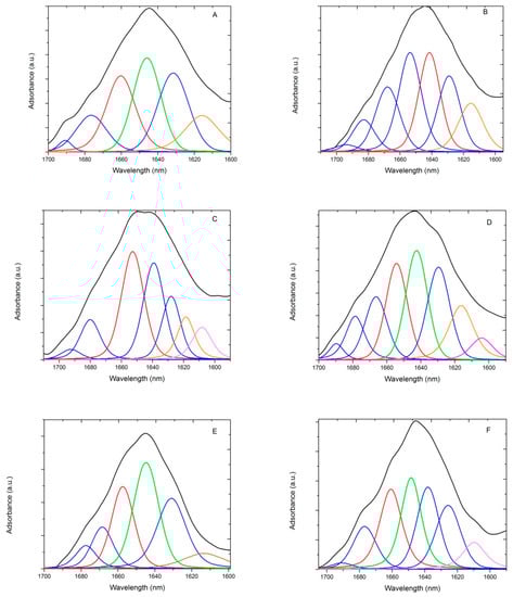 By ATR-FTIR spectroscopy, we monitored the changes in RtH secondary structure in presence of the tested ILs. The peak positions in the spectral region 1700–1600 cm−1 of the amide I bands are α-helices (1650–1658 cm−1), β-sheets (1623–1641 cm−1 and 1674–1695 cm−1), random coils (1648 cm−1), antiparallel β-sheets or β-aggregates (1610–1620 cm−1 and 1692–1698 cm−1), and side chains of amino acids (1600–1610 cm−1). The deconvoluted ATR-FTIR spectra for the native RtH and its complexes with [Chol][AA] are given in Figure 3.