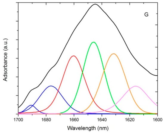 Amide I band with its underlying band subcomponents: α-helices (red), β-structures including β-sheets, β-turns, β-strands, etc. (blue), random coils or unordered structures (green), aggregates (orange), amino acid side chains (mandle) for RtH (30 mg/mL) in 50 mM sodium phosphate buffer (A) and in the presence of 0.2 M [Chol][Lys] (B), [Chol][Arg] (C), [Chol][Glu] (D), [Chol][Asp] (E), [Chol]2[Glu] (F), or [Chol]2[Asp] (G).