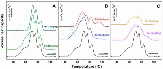 Thermal denaturation profiles of native RtH (3 mg/mL) in sodium phosphate buffer (pH 7.4, 50 mM) in the presence of 0.02 M [Chol]n[AA]. Heating rate –1 °C/min. For a comparison the DSC curves are grouped as follows: complexes of RtH with monocholinium salts containing anion of a negatively charged amino acid (A), a positively charged amino acid (B), and dicholinium salts (C).