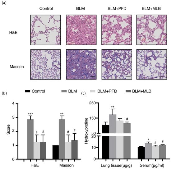 The BLM treatment induced pulmonary fibrosis in a mouse model, leading to severe pulmonary injury and collagen deposition. The results of hematoxylin and eosin (H&E) and Masson’s staining revealed that bleomycin administration disrupted the alveolar spaces and lung architecture (Figure 1a), with increased collagen deposition in lung tissue, and that MLB treatment for seven days attenuated lung injury and collagen production (Figure 1a,b and Figure S1). The results of hydroxyproline measurement showed MLB could decrease the level of hydroxyproline in BLM-treated mouse lung tissue and serum (Figure 1c).