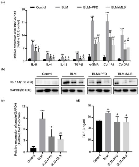 The relative mRNA expression of Col 1A1, α-SMA and Col 3A1 in mouse lung tissues was increased after BLM administration, while MLB treatment significantly reduced the number of these transcripts. The relative mRNA expression of inflammatory and pro-fibrotic cytokines, such as IL-4, IL-6, IL-13, and TGF-β, could also be inhibited with MLB treatment, verifying the anti-inflammatory effects of MLB (Figure 2a). The results of Western blot analysis and enzyme linked immunosorbent assay (ELISA) further confirmed that MLB decreased BLM-induced upregulation of Col 1A1 (Figure 2b,c), and released TGF-β in serum (Figure 2d), which was consistent with the results of the mRNA expression and hydroxyproline measurement.