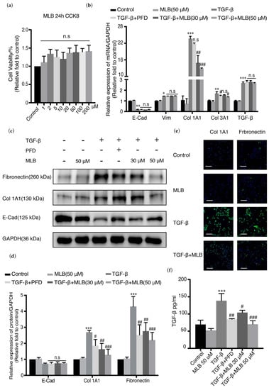 MLB inhibited collagen production in A549 cells. Quiescent cells were treated with MLB alone (50 μM), TGF-β, or both TGF-β and MLB (30, 50 μM) or pirfenidone (PFD) (30 μM) for 24 h. (a) Cell toxicity of MLB was measured by Cell Counting Kit-8 (CCK-8). (b) Relative mRNA expression of Col 1A1, Col 3A1, E-cadherin (E-Cad) and vimentin (Vim) was determined by real-time quantitative PCR. (c,d) Relative protein levels of Col 1A1, fibronectin and E-Cad were determined by Western blot and analyzed by densitometry. (e) Immunofluorescence staining for Col 1A1 and fibronectin. Bars = 130 μm, magnification: 4×. (f) The release of endogenous TGF-β was measured by using an ELISA kit. Four replicates were assessed and analyzed in each group. Data are presented as the means ± SEM of the group and compared by one-way ANOVA. The experiments were replicated four times; * p < 0.05, ** p < 0.01, *** p < 0.001 vs. Control; n.s p > 0.05, # p < 0.05, ## p < 0.01, ### p < 0.001 vs. TGF-β.
