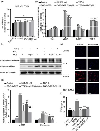 MLB inhibited TGF-β-induced myofibroblast transdifferentiation in human lung fibroblast cell line (MRC-5) cells. Quiescent cells were treated with MLB (50 μM) alone, TGF-β, or both TGF-β and MLB (30, 50 μM) or PFD (30 μM) for 48 h. (a) Cell toxicity of MLB was measured by CCK 8. (b) Relative mRNA expression of Vim, α-SMA, fibronectin, and TGF-β was determined by real-time quantitative PCR. (c,d) Relative protein levels of α-SMA and fibronectin were determined by Western blot and analyzed by densitometry. (e) Immunofluorescence staining for α-SMA and fibronectin. Bars = 130 μm, magnification: 4×. (f) The release of endogenous TGF-β was measured using an ELISA kit. Four replicates were assessed and analyzed in each group. Data are presented as the means ± SEM of the group and compared by one-way ANOVA. The experiments were replicated four times; * p < 0.05, ** p < 0.01, *** p < 0.001 vs. Control; n.s p > 0.05, # p < 0.05, ## p < 0.01, ### p < 0.001 vs. TGF-β.