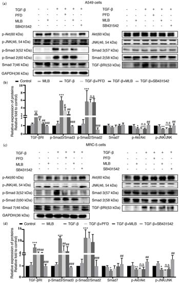 MLB inhibited TGF-β receptor I (TGF-βRI)/Smad signaling in A549 cells and MRC-5 cells. Quiescent cells were treated with MLB (50 μM) alone, TGF-β, or both TGF-β and MLB (50 μM), PFD (50 μM) and SB431542 (20 μM) for 24 h (A549 cells) or 48 h (MRC-5 cells). (a,b) The relative protein levels of TGF-βRI, Smad2, phosphorylation (p)-Smad2, Smad3, p-Smad3, Smad7, c-Jun N-terminal kinase (JNK), p-JNK, Akt, and p-Akt in A549 cells. (c,d) The relative protein levels of TGF-βRI, Smad2, p-Smad2, Smad3, p-Smad3, Smad7, JNK, p-JNK, Akt, and p-Akt in MRC-5 cells. Levels of protein were determined by Western blot and analyzed by densitometry. Four replicates were assessed and analyzed in each group. Data are presented as the means ± SEM of the group and compared by one-way ANOVA. The experiments were replicated four times; * p < 0.05, ** p < 0.01, *** p < 0.001 vs. Control; n.s p > 0.05, # p < 0.05, ## p < 0.01, ### p < 0.001 vs. TGF-β.