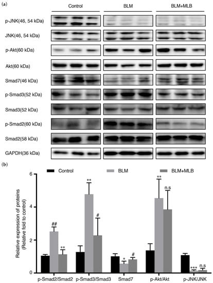 Effect of MLB on TGF-β signaling in BLM-treated lung tissue. (a) The relative protein levels of Smad2, p-Smad2, Smad3, p-Smad3, Smad7, JNK, p-JNK, Akt, and p-Akt in lung tissue were determined by Western blot and analyzed by densitometry (b). Data are presented as the means ± SEM of the group and compared by one-way ANOVA; * p < 0.05, ** p < 0.01, *** p < 0.001 vs. Control; n.s p > 0.05, # p < 0.05, ## p < 0.01, ### p < 0.001 vs. BLM.