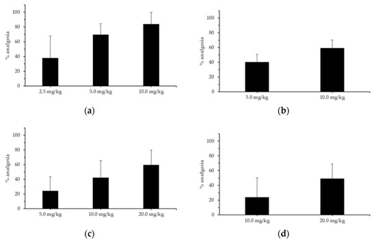 The analgesic potency of compound 6a and ralfinamide (n = 8). (a). The results of the dose-effect relationship assay of compound 6a. (b). The results of the oral administration assay of compound 6a. (c). The results of the dose-effect relationship assay of ralfinamide. (d). The results of the oral administration assay of ralfinamide.