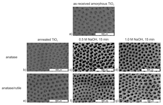 FE-SEM images of nanoporous TiO2 layers non-modified (a,b,e) and modified with 0.5 M (c,f) or 1.0 M (d,g) NaOH for 15 min. The TiO2 layers were non-annealed (a) and annealed at 400 (b–d) or 600 °C (e–g) for 2 h before the surface modification with NaOH.