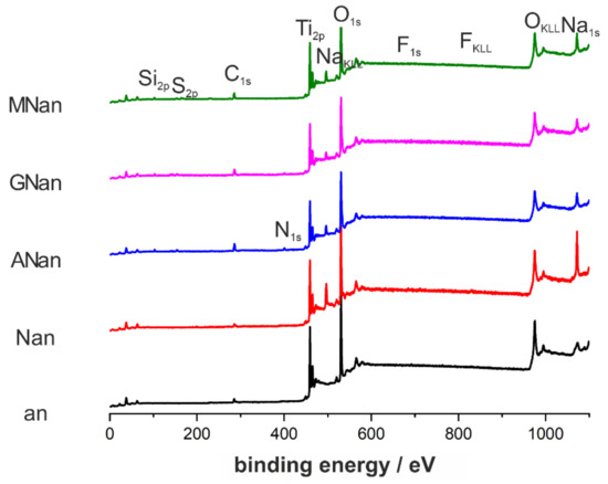 XPS (X-Ray Photoelectron Spectroscopy) survey spectra of the non-modified (an) and modified (Nan, Anan, GNan, and MNan) TiO2 samples.