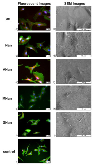Representative immunofluorescence and FE-SEM microphotographs of MG-63 osteoblast-like cells grown on the non-modified (an) (a,b) and modified (Nan, Anan, GNan, and MNan) (c–j) TiO2 samples, and the control (polystyrene) (k) after 24 h of culture. For fluorescent microscopy imaging, cells were stained with actin skeleton (green), cell nuclei (blue), and vinculin (red). Scale bar = 50 μm.