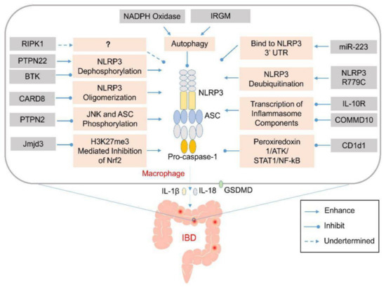 Genetic abnormalities affect development of inflammatory bowel disease (IBD) by elevating the activation of inflammasomes via various cellular processes. Various genetic factors might prevent the activation of the NLRP3 inflammasome via various mechanisms that affect NLRP3 oligomerization or modulate autophagy. Their absence might induce aberrant activation of the NLRP3 inflammasome and excess production of IL-1Ξ² and IL-18 in the infiltrating macrophages or dendritic cells in the lamina propria of the colon. The released pro-inflammatory cytokines and pyroptosis-mediated release of cellular contents might recruit other inflammatory mediators to promote the expansion of the colonic inflammation.