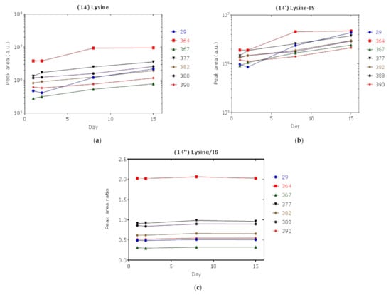 In order to investigate the stability of the Me-PFP derivatives of the endogenous amino acids and of the internal standards we plotted separately their peak area values against the storage time of the toluene extracts. The results of this analysis are illustrated in the Supplementary Figure S1 for all amino acids and in Figure 1 exemplarily for lysine.