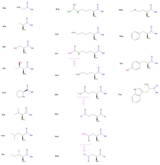 Chemical structures of the amino acids investigated in the present study. The functionalities being accessible to derivatization are colored. Blue, carboxylic group; Green, amine; Red, OH; Magenta, ureido, carbamoyl. Cit, citrulline; Orn, ornithine. The chemical structure of homoarginine (hArg), the methylene homolog of arginine (Arg) is not shown.
