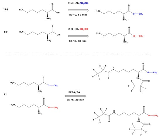 Two-step derivatization of lysine representative of the chemical class of amino acids. Separate esterification with 2 M HCl in CH3OH for biological amino acids (1A) and with 2 M HCl in CD3OD for synthetic amino acids (1B) to serve as internal standards. (2) Combined acylation with pentafluoropropionic anhydride (PFPA) in ethyl acetate (EA; 1:4, v/v).