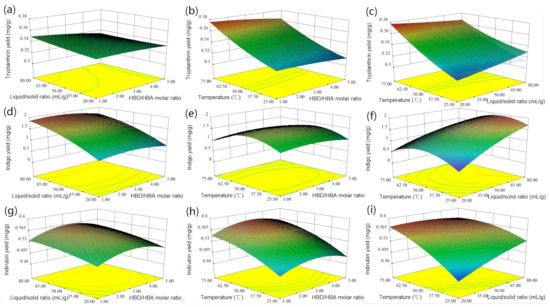 | A (HBD–HBA Molar Ratio) | B (Liquid–Solid Ratio, mL/g) | C (Temperature, ℃) | Tryptanthrin (mg/g) | Indigo (mg/g) | Indirubin (mg/g) | |