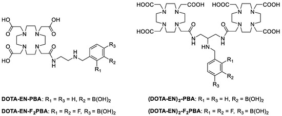 Structures of monomeric (DOTA-EN)- and dimeric (DOTA-EN)2-phenylboronic compounds.