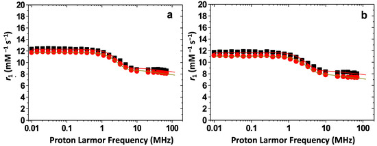 First, a complete 1H and 17O NMR relaxometric study was carried out on the monomers to obtain a more accurate analysis of the water exchange dynamics of the GdIII complexes. Thus, the accurate value of the water exchange time τM (Table 1) was obtained by analyzing the temperature dependence of the 17O NMR transverse relaxation rate (1/T2) and the paramagnetic shift (Δω) of the solvent water at 11.7 T. The experimental data, reported as reduced transverse relaxation rates (1/T2r) and reduced chemical shifts (Δωr), are shown in Figure 4. The 1H NMRD and 17O NMR data were fitted simultaneously, according to the established theory of paramagnetic relaxation. Thus, while NMRD data were analyzed using the standard Solomon–Bloembergen–Morgan model for the inner-sphere relaxation mechanism [22,23,24] and Freed’s model for the outer-sphere components [25], the temperature dependence of 1/T2r and Δω was evaluated by using the Swift–Connick equations [26,27] (see details in the Supplementary Materials). Due to the number of parameters implicated in the fitting procedure, some of them were fixed to known or plausible values, namely the hydration number (q), the GdIII-H2O distance (r), the distance of closest approach of the outer sphere water molecules to GdIII (a) and the relative diffusion coefficient at 25 °C (D). The temperature dependence of τV (correlation time for the modulation of the transient zero-fit splitting, ZFS) and τR has been considered through their activation energies EV (set to 1 kJ mol−1) and ER (fixed to 10 kJ mol−1). The fit was carried out using τR, Δ2 (trace of the ZFS), τV, τM, the enthalpy of activation ΔHM and the scalar Gd-17Ow coupling constant A/ħ as adjustable parameters. The best-fit parameters for GdIII-DOTA-EN-PBA and GdIII-DOTA-EN-F2PBA (Table 1) show values in line with those reported for other GdIII-DOTA monoamides [19,28], both in terms of electronic parameters (Δ2and τV) and of water exchange dynamics. In particular, τM values of 471 ns for GdIII-DOTA-EN-PBA and 486 ns for GdIII-DOTA-EN-F2PBA were determined, slightly lower than those reported for other GdIII-DOTA monoamides [19,28,29]. Finally, the shape of the 1/T2r plot is further confirmation of a q = 1 hydration state.