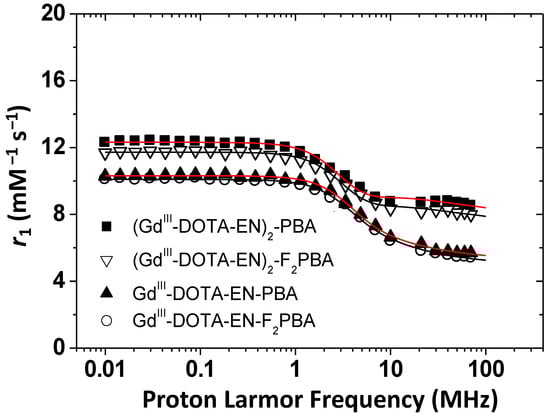 Comparison between the 1H NMRD profiles of aqueous solutions of (GdIII-DOTA-EN)2-PBA, (GdIII-DOTA-EN)2-F2PBA, GdIII-DOTA-EN-PBA and GdIII-DOTA-EN-F2PBA. All profiles were acquired at 25 °C and pH 7. The solid lines represent the best-fitting results of the experimental data points.