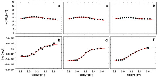 Reduced transverse 17O relaxation rates (top) and chemical shifts (bottom) measured at 11.7 T and pH 7 for GdIII-DOTA-EN-PBA (a,b), GdIII-DOTA-EN-F2PBA (c,d) and (GdIII-DOTA-EN)2-F2PBA (e,f). The solid lines represent the best-fitting results of the experimental data points.