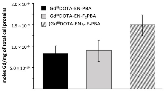 Considering the combined improvements (i.e., the two paramagnetic ions and the higher acidity of the boronic moiety), (GdIII-DOTA-EN)2-F2PBA represents the most promising dimeric MRI agent, and therefore, it was chosen for the evaluation tests on the ability of cell binding. The initial investigation was conducted on murine melanoma B16-F10 cells, in order to compare the results directly with the previous experiments on the monomeric species [9]. While the cell binding of GdIII-DOTA-EN-PBA and GdIII-DOTA-EN-F2PBA was comparable, as was expected, the amount of gadolinium internalized by cells incubated in the presence of Gd dimer is significantly higher due to the 2:1 ratio between GdIII-chelates and PBA in each molecule (Figure 5). It is possible that the presence of two chelates increases the polarity of that side of the probe, thus partially affecting its internalization by cells, and explaining why the measured Gd amount is less than twice the amount of the monomers (ca 1.5-fold).