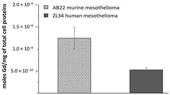 A study that has recently been reported in the literature highlights that mesothelioma cells express a high amount of SA on their surface [31,32,33]. Mesothelioma is the malignant neoplasm of the mesothelial cells and is a highly aggressive tumor lacking any significant therapies. Thus, it was decided to implement a binding test of (GdIII-DOTA-EN)2-F2PBA with two mesothelioma cell lines (ZL34 human and AB22 murine). The results presented in Figure 6 show a high amount of cell bound fluorinated Gd dimer that, in the case of AB22, was similar to that found for the B16 melanoma. Since there is no evidence in the literature for a distinctive SA expression by mesothelioma cells of various species, the difference in binding found for AB22 and ZL34 can be explained by the intrinsic variability of SA in these tumors.